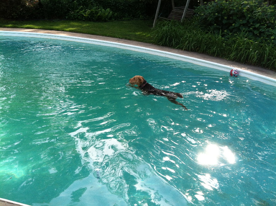 [My son's Airedale] Jezzy just LOVES to swim in their pool.