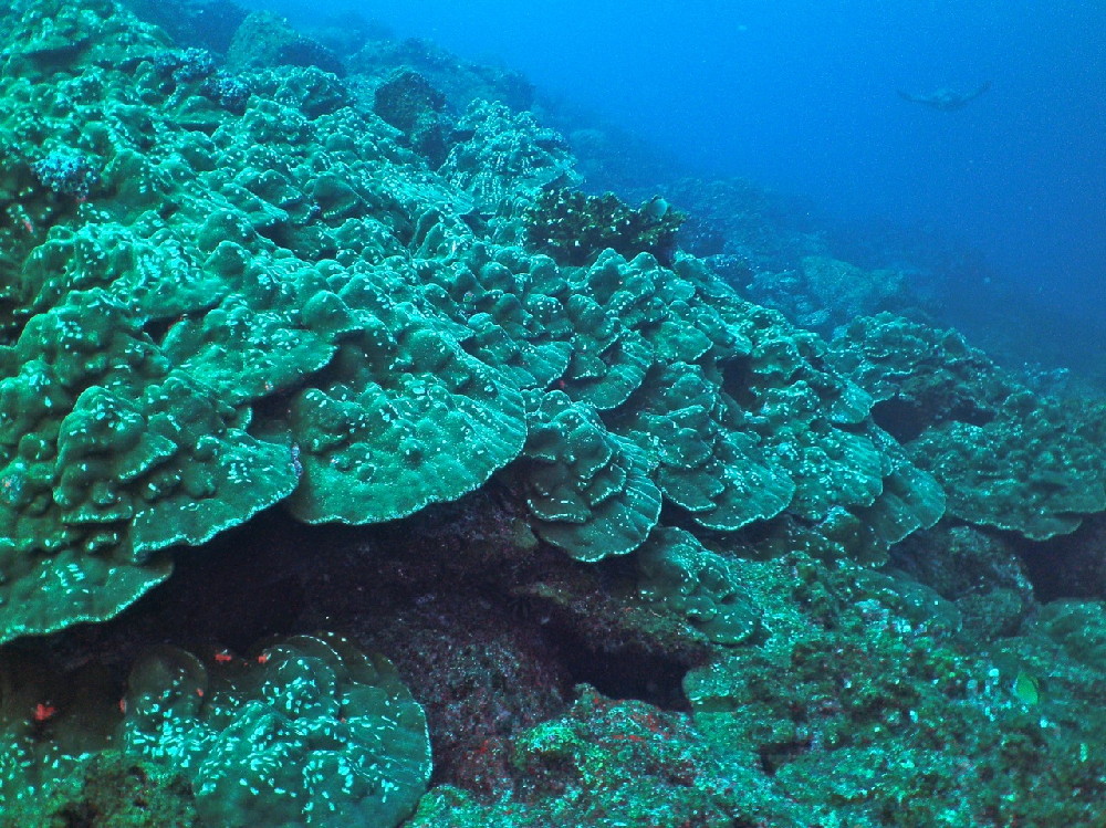 We had breakfast after the first dive. Third dive: a few hammerheads below us, and I shot pics of some macro life, plate corals, other corals and fish I didn't recognize. THREE GREEN TURTLES under water and two more sunning on the surface more than made up for the absent pelagic fishes. I got some great shots then and swam alongside the turtles, too (always exhilarating)