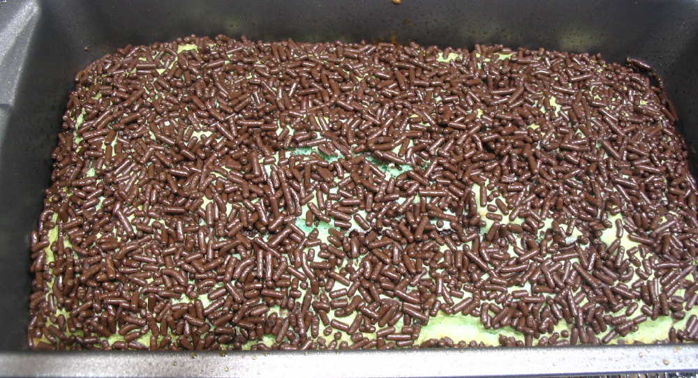 . . . chocolate jimmies on top and into the oven for 45 minutes . . .