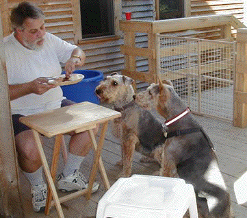 In a little bit, a big RV pulled in with Bob & Lynn O'Shaughnessy and more cousins and friends. I was at their house once with Andy IV. Rescue'dales Katie & Dusty came with their buddy Killian the adopted German Shepherd. There was lots of talking, eating, and playing on the deck. Fifteen four-legs is too much for me, especially those pesky children that do nothing but play and wrestle. I laid down in the bathroom for some peace and quiet. | |
