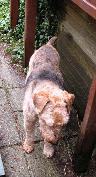 On Monday, I went to visit the girls; I saw two very tiny Airedales who live outside. They have a unique "kennel" arrangement under the upper deck - a sort of manger with hay for bedding - and a small outer yard where they can lie in the sun or stretch their legs. Both girls were happy to accept treats although Judy, the 14-year-old girl, preferred to stay in her little "kennel" where it was slightly warmer. Tyner bounced out to visit with me, gobbled treats and danced around, clearly craving attention.