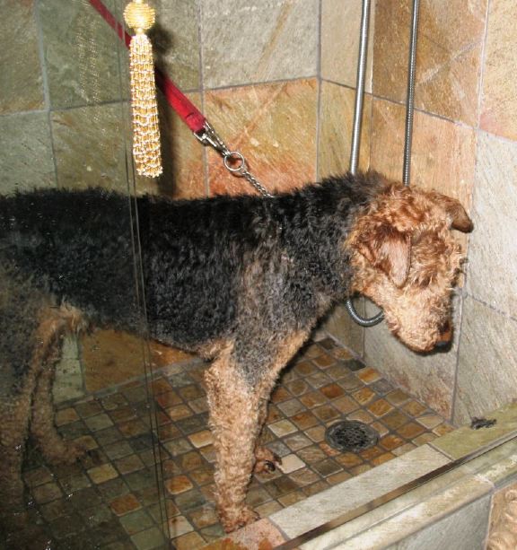 While I was drying Judy, I noticed she has several large lumps, two at the base of her tail; another on her flank. She doesn't much like the one on her side touched. She had a patch of scaly, dead skin on her thigh that I've combed loose, and very scabby ears. There are a few mats in her coat but not many - her fur is way too short. She was cold after her bath, despite being dried, so she's wearing one of Angie's jackets. Angie was not a very big Airedale but Judy swims in this jacket.