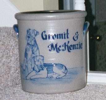A crock we had made of Gromit & McKenzie at Rowe Pottery in Cambridge, Wisconsin. Now we need another crock