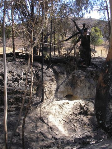 Some of you will remember Little Forrest Wombat's story of rescue and survival in 2005 [which can be read HERE]. You will be happy to know that the wombat I call Little Forrest's Auntie has survived this horrific event, and I photographed her 48 hours after the fire had passed, sitting outside her burrow amid the ashes of what once was her creekside home.